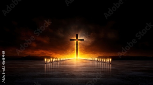 Naklejka premium A glowing cross illuminates a dark landscape, symbolizing hope.