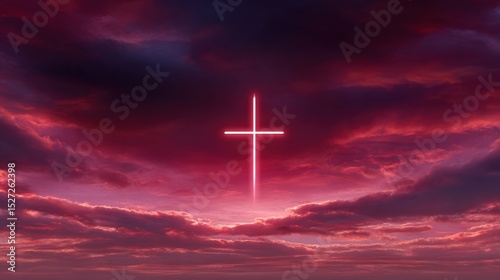 Naklejka premium A glowing cross illuminates a dramatic sky filled with vibrant red clouds,...