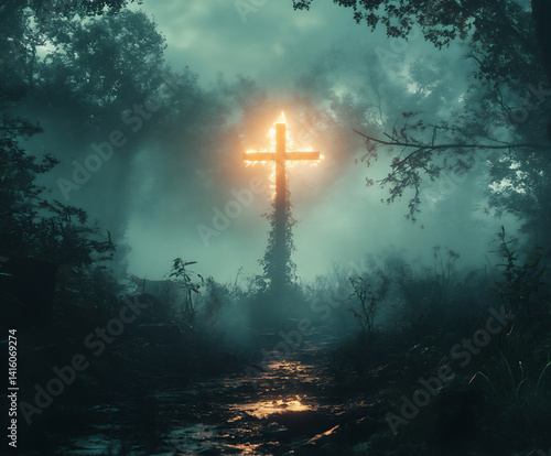 © 자인 김, Naklejka premium a glowing cross in a mystical forest, serene atmosphere, ethereal light, detailed, 4k.