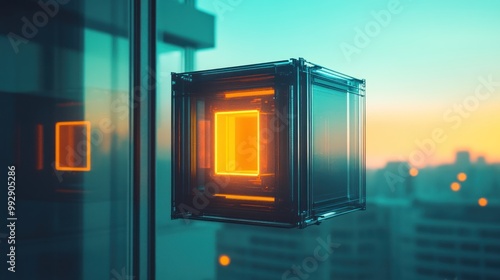 © BerkahStock, Fototapeta premium A glowing cube suspended in a modern urban setting at sunset.