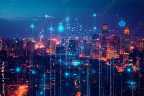 © Suresh Thangavel, Obraz premium A glowing cyberpunk city skyline with neon lights and holograms