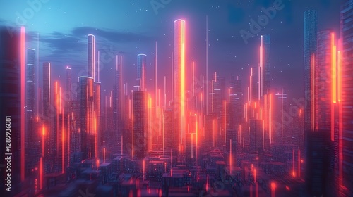 © SyabilaSyifa, Fototapeta premium A glowing 3D bar chart rising against a digital cityscape background