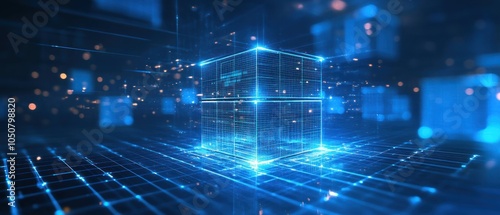 Fototapeta premium A glowing 3D cube surrounded by a digital grid, symbolizing technology and...
