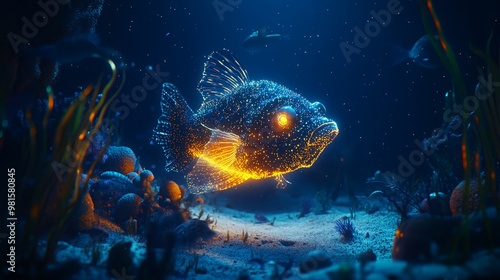Naklejka premium A glowing, digital fish swims through an underwater coral reef.