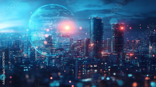 Fototapeta premium A glowing digital globe hovers over a futuristic cityscape, representing...