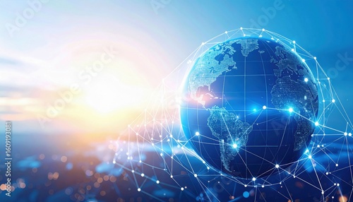 © Nopadon, Obraz premium A glowing digital globe with network connections represents global communication and technology integration against a blurred cityscape at sunrise.