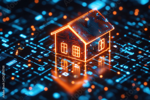 © Steven, Obraz premium A glowing digital house model on a blue circuit board background, symbolizing smart technology and connectivity in modern homes.