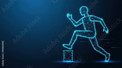 © Eman Suardi, Fototapeta premium A glowing digital human silhouette leaping over a geometric cube representing progress and achievement in a futuristic blue background