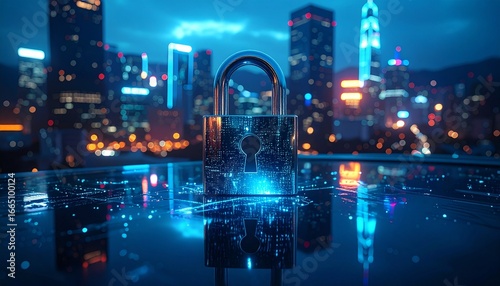 © Theerapat, Fototapeta premium A glowing digital padlock with a keyhole stands on a reflective surface, symbolizing data security and internet protection in a blurred modern city at night.