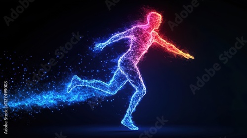 Fototapeta premium A glowing digital representation of a running human figure, illuminated in vibrant blue and red neon lights, against a dark background