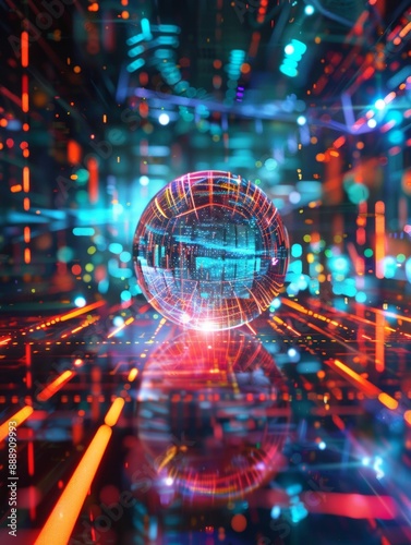 Obraz premium A glowing digital sphere displayed on a futuristic surface adorned with...