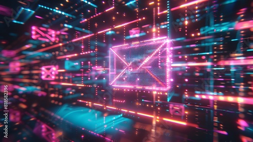 Fototapeta premium A glowing e mail icon floating in the center of an abstract grid with colorful light streaks .