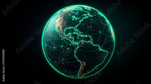 © rujlaphus, Obraz premium A glowing Earth is depicted against a black backdrop. The interconnected globe is illuminated with bright green lines and points, showcasing a network.