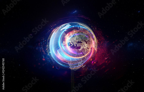 © joeycheung, Obraz premium A glowing Earth with continents outlined, illuminated by a network of lines extending from the surface into space.