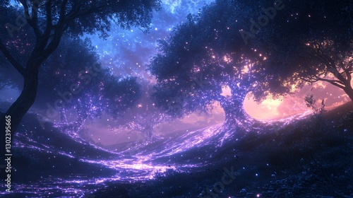 © Omizzoda, Naklejka premium A glowing forest with trees emitting soft, pulsing energy waves