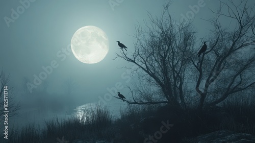 Naklejka premium A glowing full moon casting light over a foggy autumn landscape, with bare trees and crows perched on branches, creating a moody Halloween atmosphere