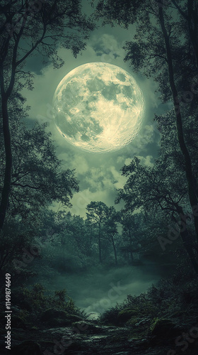 Fototapeta premium A Glowing Full Moon Illuminating a Dense Forest