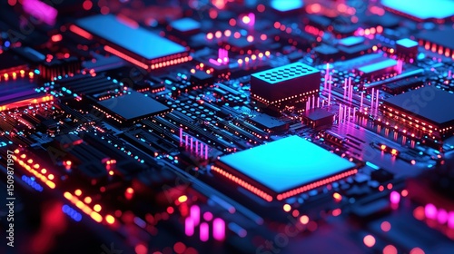 Fototapeta premium A glowing, futuristic circuit board illuminated by vibrant blue and pink LED...