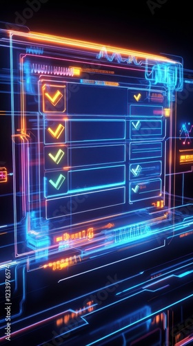 Fototapeta premium A glowing, futuristic interface displays checkboxes with colorful indicators, suggesting digital task completion in a high-tech environment.