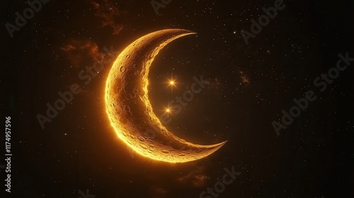 Fototapeta premium A glowing golden crescent moon against a starry night sky. Ideal for Ramadan, Eid, or other celestial-themed projects.