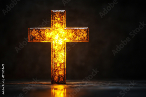 © Sung Hwan Kim, Naklejka premium a glowing golden cross against a black background,