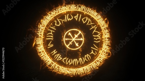 © Ariestia, Fototapeta premium A glowing golden magical circle surrounded by mysterious inscriptions
