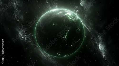 © Cintya, Obraz premium A glowing green planet amidst a dark and star filled space scene