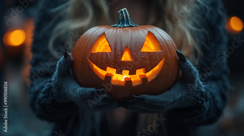 Naklejka premium A glowing Halloween pumpkin held by a person, showcasing a cheerful...