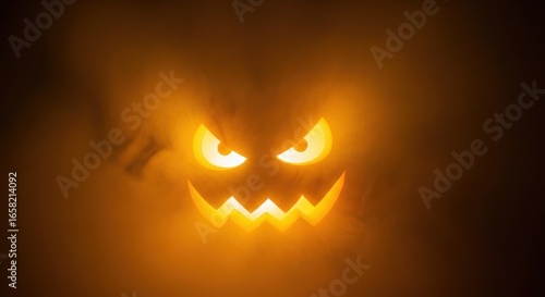 © Muhammad, Fototapeta premium A glowing jack o lantern face with sharp teeth and angry eyes in a dark and foggy background scene