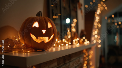 Fototapeta premium A glowing jack o lantern on a mantelpiece surrounded by string lights creating a festive atmosphere