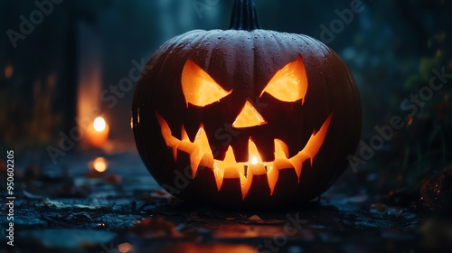 © Dinara, Naklejka premium A glowing jack-o'-lantern sits on a dark, wet forest floor, its menacing grin illuminated by a flickering candle.