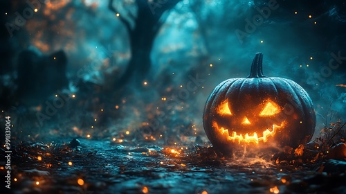 Fototapeta premium A glowing jack-o'-lantern with a menacing grin sits in a misty, dark forest.