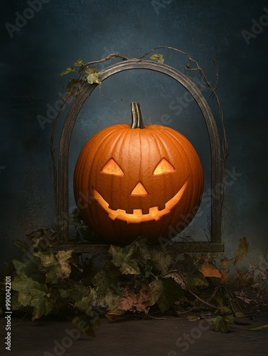 © Sanwa, Naklejka premium A glowing jack-o'-lantern with a mischievous grin sits inside a rustic metal frame, surrounded by autumn leaves, creating a spooky and festive Halloween atmosphere.