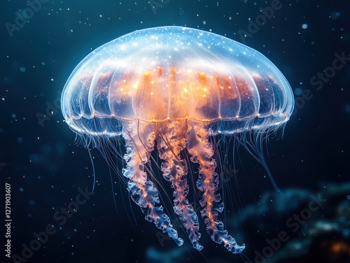 Fototapeta premium A glowing jellyfish drifts gracefully underwater, showcasing vibrant colors...