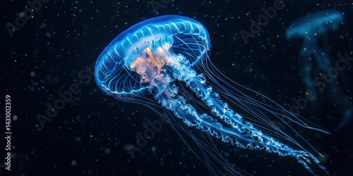 Fototapeta premium A glowing jellyfish floating in the dark ocean, its tentacles illuminated by bioluminescence