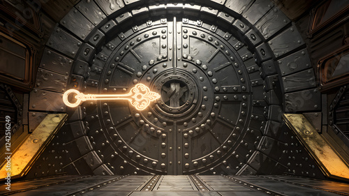 Obraz premium A glowing key unlocking a massive steel door.