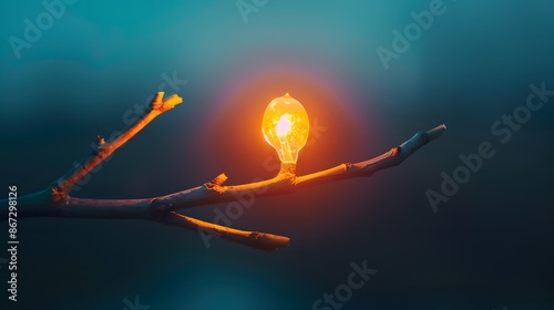 Fototapeta premium A glowing light bulb sits on a bare tree branch, symbolizing hope and new...