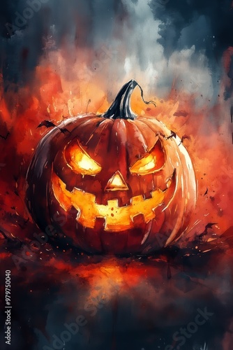 Fototapeta premium A glowing, menacing jack-o'-lantern surrounded by an ominous, fiery...