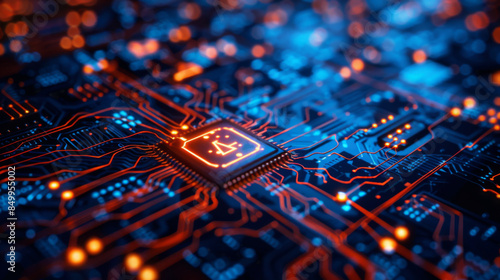 Fototapeta premium A glowing microchip at the center of an intricate high-tech circuit board,...