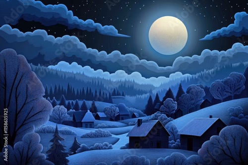 Fototapeta premium A glowing moonlit night over a quiet village in a layered paper - cut style