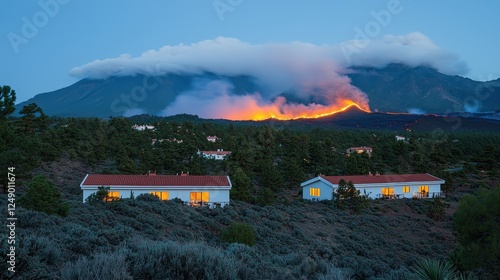 © Junior, Fototapeta premium A glowing mountain village engulfed in thick fog and ash after a nearby volcanic eruption, with rooftops barely visible through the haze. The eerie glow from the distant lava flow adds a sense