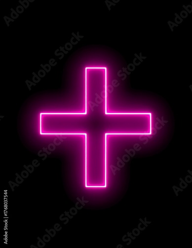 © Anisa Rahma dani, Obraz premium A glowing neon pink plus sign against a solid black background
