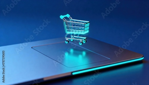 Fototapeta premium A glowing neon shopping cart levitates over a laptop trackpad. Futuristic e-commerce, online shopping, and digital retail technology concept