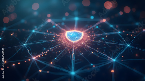 Obraz premium A glowing network of interconnected nodes and lines, with a large shield icon...