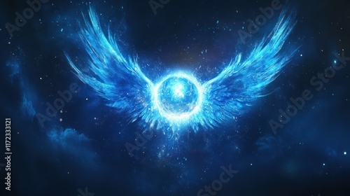 Obraz premium A glowing orb with ethereal wings, set against a cosmic backdrop, symbolizing...