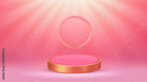 © KP, Obraz premium A glowing pedestal with a circular display area, set against a pink background, creating a vibrant and inviting presentation space.