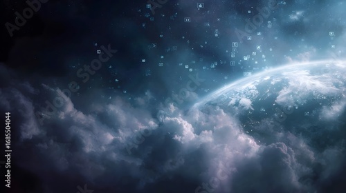 Fototapeta premium A glowing planet with digital data icons floating in a cloudy dark sky...