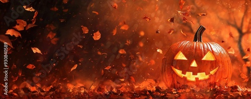 Fototapeta premium A glowing pumpkin sits amidst falling leaves, capturing the essence of...