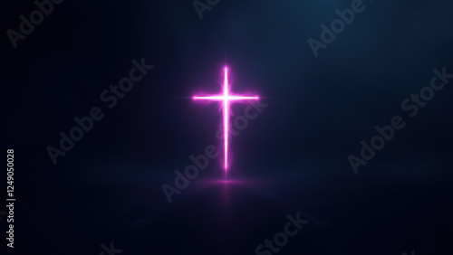 © Tameem, Fototapeta premium A glowing purple cross against a dark background with soft light effects.