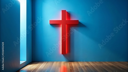 © NongPim, Naklejka premium A glowing red cross affixed to a vibrant blue wall within a minimalist interior space featuring a hardwood floor and a subtle light source
